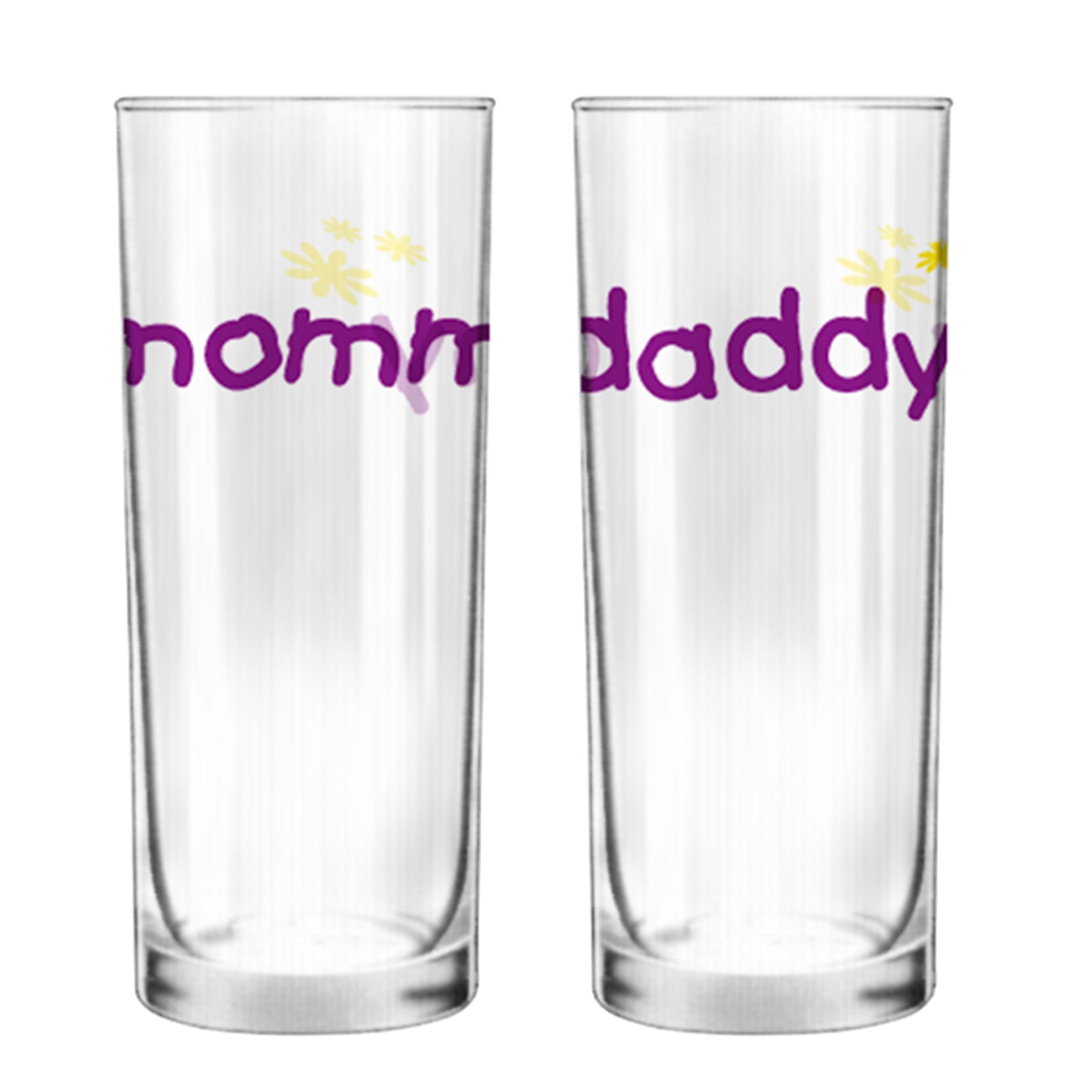 Two drinking glasses packed nicely in a gift box. Separate image printed on each glass.